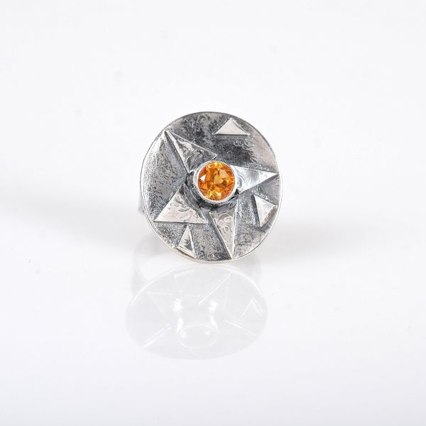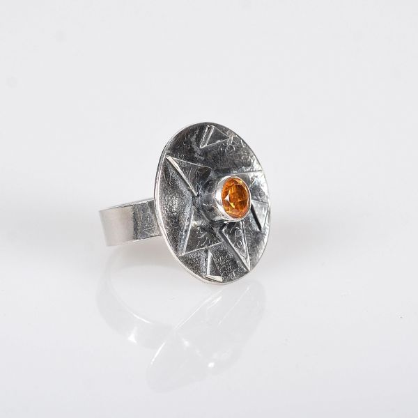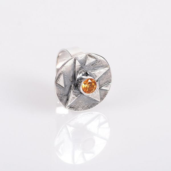 Pierścień z ręcznie fakturowanego i polerowanego srebra, ozdobiony oczkiem z naturalnego cytrynu.