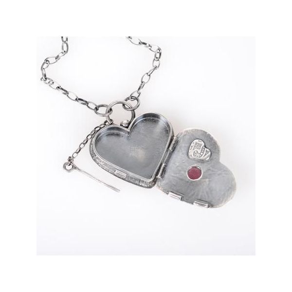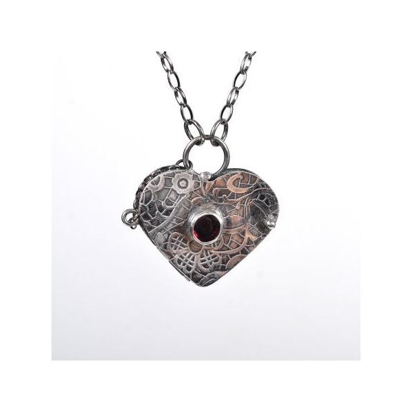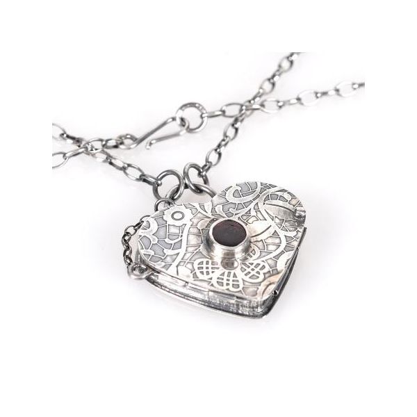 Sekretnik w kształcie serca na łańcuszku, wykonane z ręcznie fakturowanego, barwionego i polerowanego srebra. Specjalne zamknięcie pozwala ukryć wewnątrz wisiora niewielką rzecz bliską naszemu sercu. Sekretnik zdobi oczko z przejrzystego granatu.